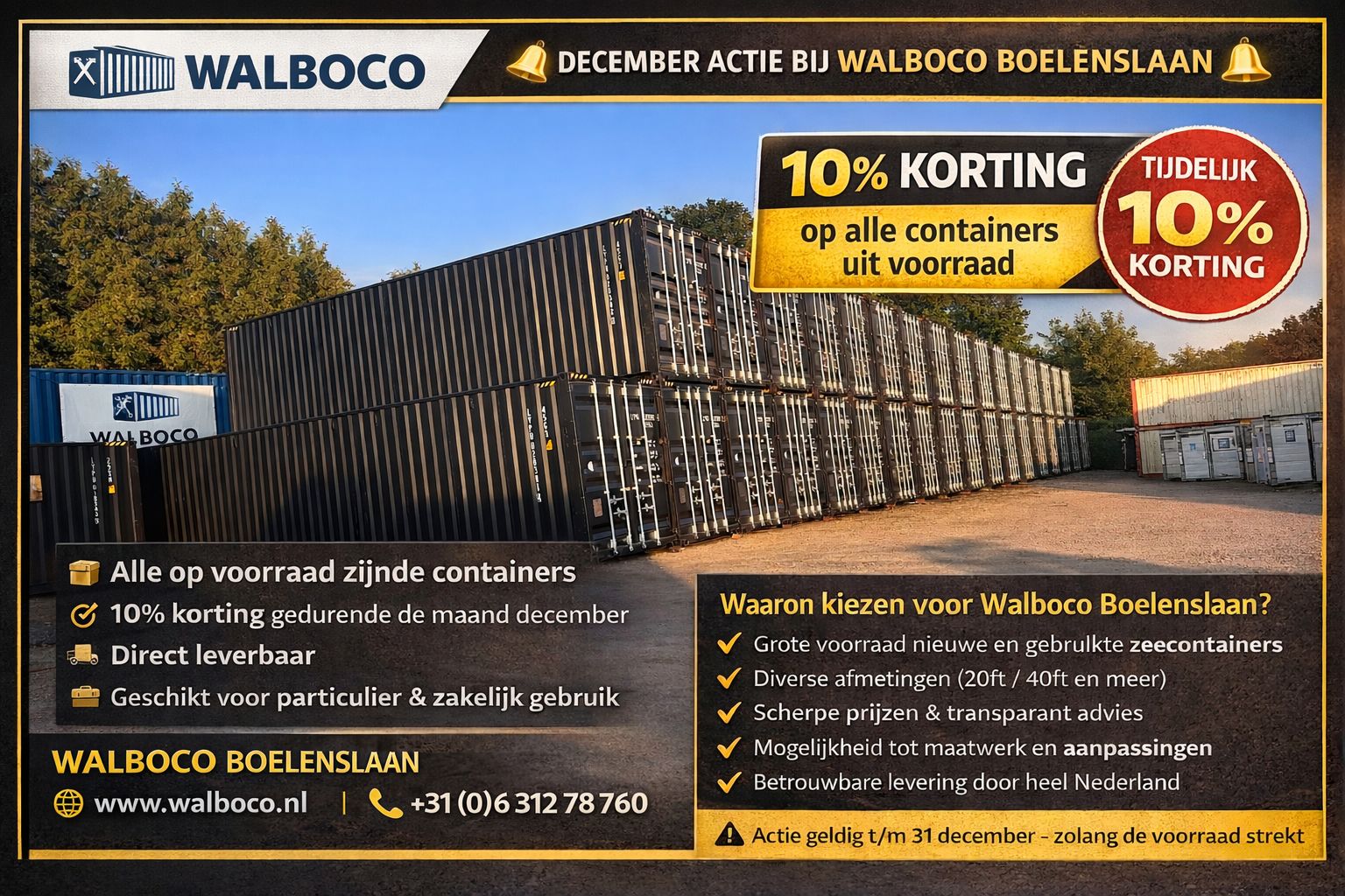 Zowel nieuwe als gebruikte containers beschikbaar. Profiteer nu van onze feestdagen aanbieding: 10% korting op alle containers! Die op onze locatie Boelenslaan staan. Ideaal voor opslag, transport of creatieve projecten.